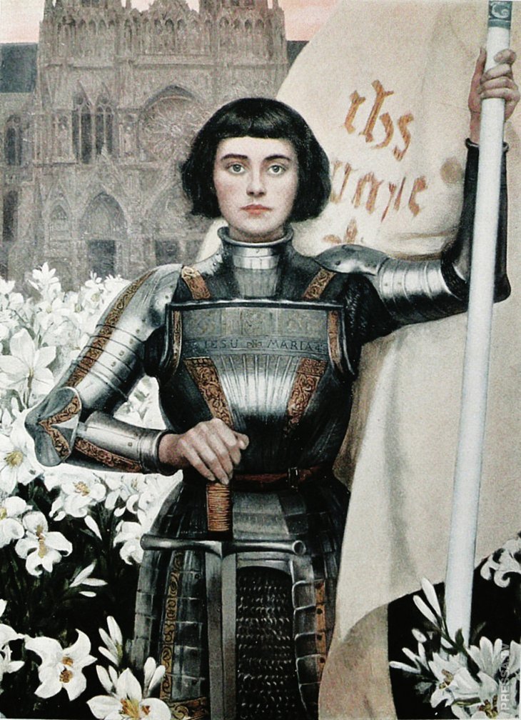 Жанна Д’ Арк — французская героиня, командующая французской армии в годы Столетней войны. Сожжена на костре как еретичка. В 1920-м причислена к лику святых.