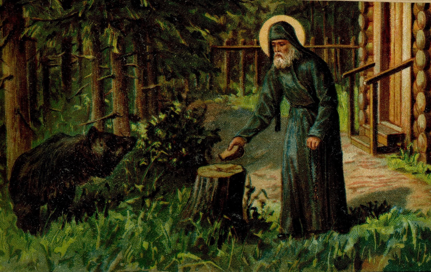 Однажды святой увидел рядом с церковью большого медведя, который совсем ослабел от голода. Монах пожалел животное и отдал ему кусочек хлеба. Зверь принял угощение, а потом стал приходить за новой порцией пищи. В итоге медведь часто навещал своего одинокого друга и стал совсем ручным.